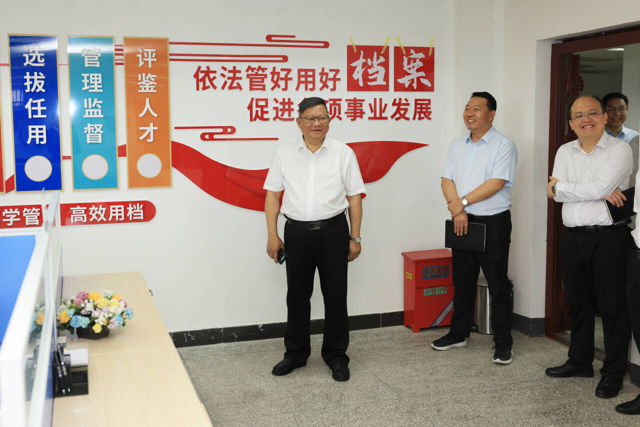 鄧軍一行聽取了檔案館負(fù)責(zé)人關(guān)于檔案工作現(xiàn)狀及主要成績、檔案工作存在的主要問題、下一步工作思路和亟待解決的困難等情況的匯報,對檔案館成立以來在開展檔案管理標(biāo)準(zhǔn)化規(guī)范化建設(shè)等方面取得的成績給予高度肯定,并就檔案館建設(shè)場地、人員配備、建設(shè)經(jīng)費等問題進(jìn)行現(xiàn)場辦公,逐一提出解決方案和指導(dǎo)意見。他指出,檔案館自成立以來,全體檔案干部職工以愛崗敬業(yè)的精氣神、過硬的工作作風(fēng),用心用情用力推進(jìn)檔案工作提質(zhì)增效,檔案工作目標(biāo)明確、重點突出、措施有力,為推動學(xué)校加快發(fā)展高質(zhì)量發(fā)展貢獻(xiàn)了“檔案力量”。