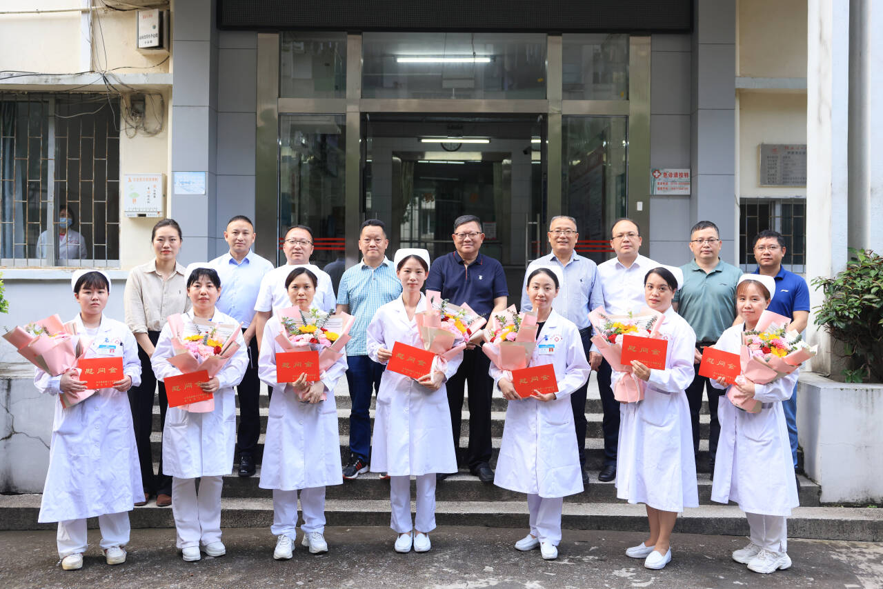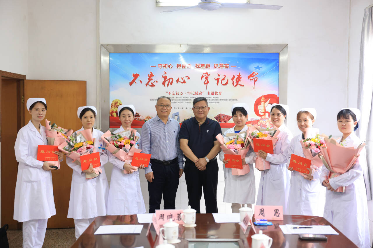 鄧軍書記和王敦球校長為護(hù)士代表送上節(jié)日鮮花并發(fā)放慰問金