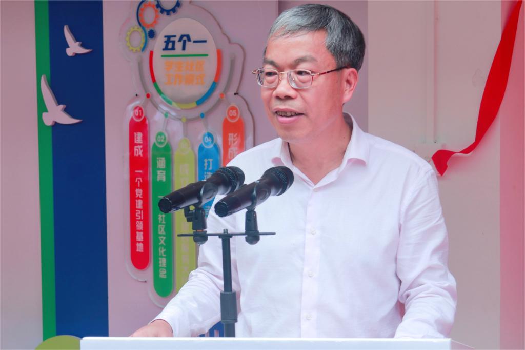 黎貞崇在揭牌儀式講話,他代表學(xué)校向材苑“一站式”學(xué)生社區(qū)的揭牌啟用表示熱烈祝賀,向為材苑“一站式”學(xué)生社區(qū)建設(shè)付出辛勤勞動的師生員工表示衷心感謝。他指出,實施“一站式”學(xué)生社區(qū)綜合管理模式建設(shè),是深入學(xué)習(xí)貫徹習(xí)近平總書記關(guān)于教育重要論述的具體實踐,也是全力打通“三全育人”里程、助力學(xué)生德智體美勞全面發(fā)展的有力舉措。學(xué)生社區(qū)綜合管理模式的建設(shè)有利于更加全面掌握了解學(xué)生動態(tài),更好地服務(wù)學(xué)生成長成才,讓社區(qū)成為黨建引領(lǐng)和業(yè)務(wù)工作的重要陣地,對于學(xué)校管理和學(xué)生成長具有重大意義。