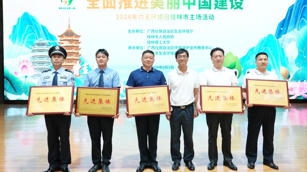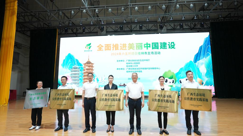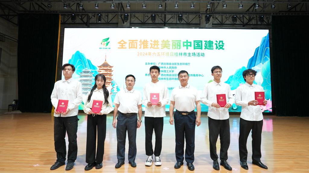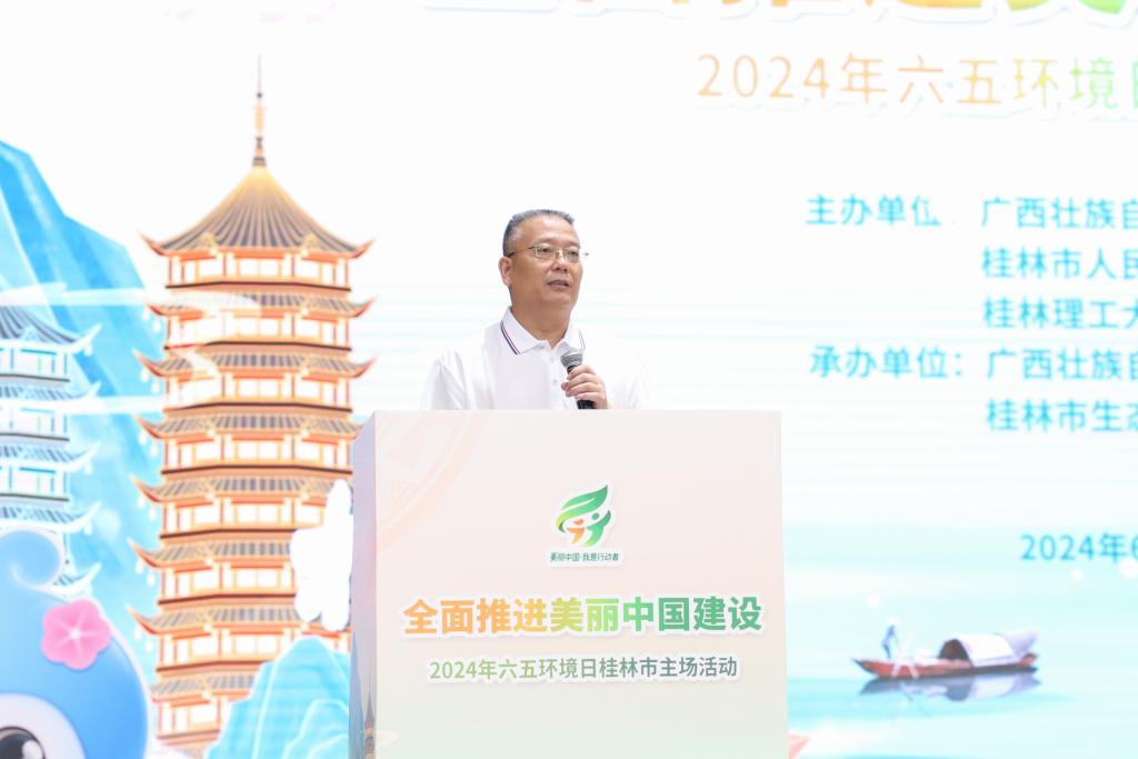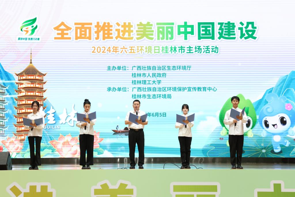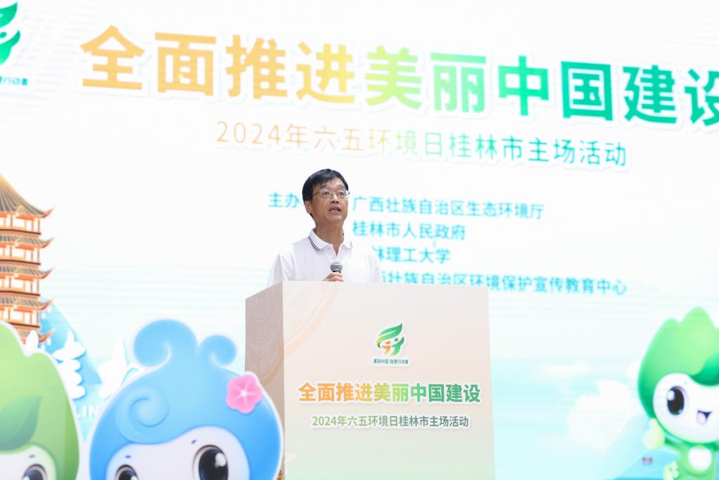 在第53個(gè)世界環(huán)境日到來(lái)之際,6月5日上午,由自治區(qū)生態(tài)環(huán)境廳、桂林市人民政府、桂林理工大學(xué)主辦的全面推進(jìn)美麗中國(guó)建設(shè)——2024年六五環(huán)境日桂林市主場(chǎng)活動(dòng)在我校雁山校區(qū)綜合體育館舉行。桂林市人民政府二級(jí)巡視員周作智,我校校長(zhǎng)王敦球,黨委常委、宣傳部部長(zhǎng)葉昊,桂林市生態(tài)環(huán)境局局長(zhǎng)張曉陽(yáng),自治區(qū)桂林生態(tài)環(huán)境監(jiān)測(cè)中心主任蔣永光出席活動(dòng),桂林市相關(guān)部門(mén)負(fù)責(zé)人,有關(guān)企業(yè)代表,獲獎(jiǎng)代表,我校相關(guān)部門(mén)負(fù)責(zé)人、師生代表,媒體記者,桂林市環(huán)保社會(huì)組織、環(huán)保志愿者代表約350余人參加本次活動(dòng)。