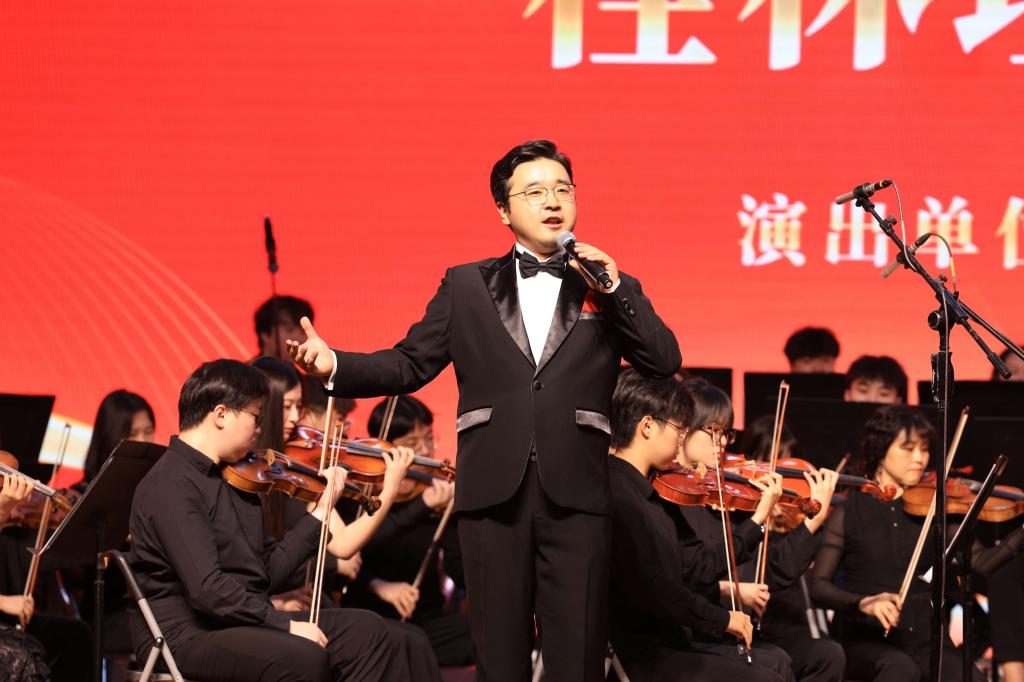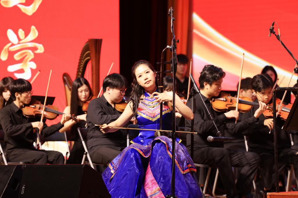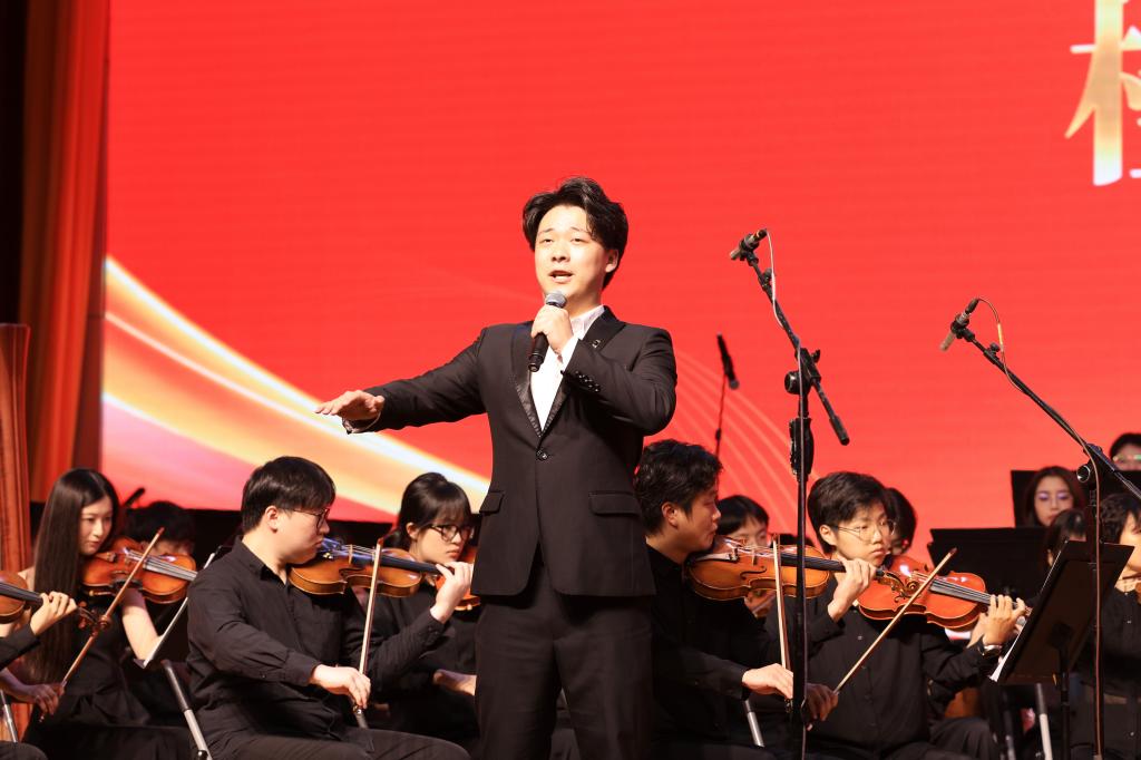音樂會在莫扎特的《費加羅的婚禮》序曲中拉開帷幕;隨之而來的《卡門第一組曲》(選段),以其旋律優(yōu)美、氣勢磅礴的音符,將觀眾帶入了浪漫的音樂世界;男聲獨唱《我的愛人,你可聽見》深情款款,將對戀人的思念和柔情展現(xiàn)得淋漓盡致;二胡與樂隊《戰(zhàn)馬奔騰》將“戰(zhàn)馬”的形象栩栩如生地展現(xiàn)出來,激起了在場觀眾的熱血與豪情;女聲獨唱《在希望的田野上》唱出了人民群眾對美好生活的熱愛;莫扎特的《g小調(diào)第四十號交響曲》展現(xiàn)了古典音樂的魅力;獨唱《把一切獻給黨》、小提琴與樂隊《如愿》深刻地表達了對黨的忠誠、對事業(yè)的熱愛以及對美好生活的向往?!霸跍嘏猴L里,在燦爛陽光下,在寂寂秋水旁,在銀裝素裹里等你。”歌曲《等你》濃濃的人文情懷展現(xiàn)了對美好未來的期許,讓師生們陶醉其中。管弦樂《我的中國心》、合唱《領航》以其雄渾的氣勢和鏗鏘有力的音符,激蕩在場觀眾的愛國熱情與民族自豪感。