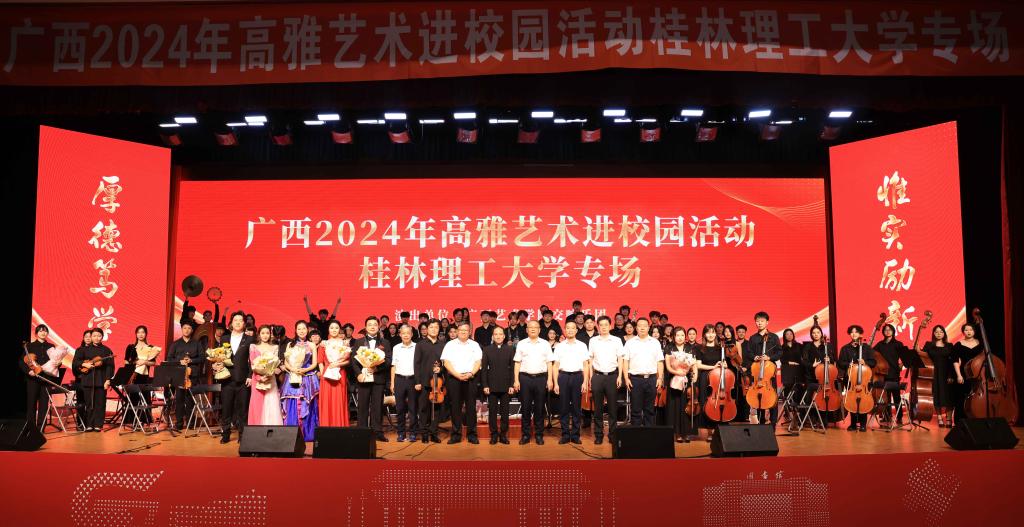 為進一步豐富校園文化,提高師生藝術修養(yǎng),6月7日,由自治區(qū)教育廳主辦、我校承辦的2024年高雅藝術進校園活動廣西藝術學院交響樂團專場演出在我校屏風校區(qū)體育館精彩上演,校領導鄧軍、王敦球、韋學敏、王磊、黎貞崇、羅盛鋒,與現(xiàn)場近1200名師生代表歡聚一堂,共同聆聽這場音樂盛宴。