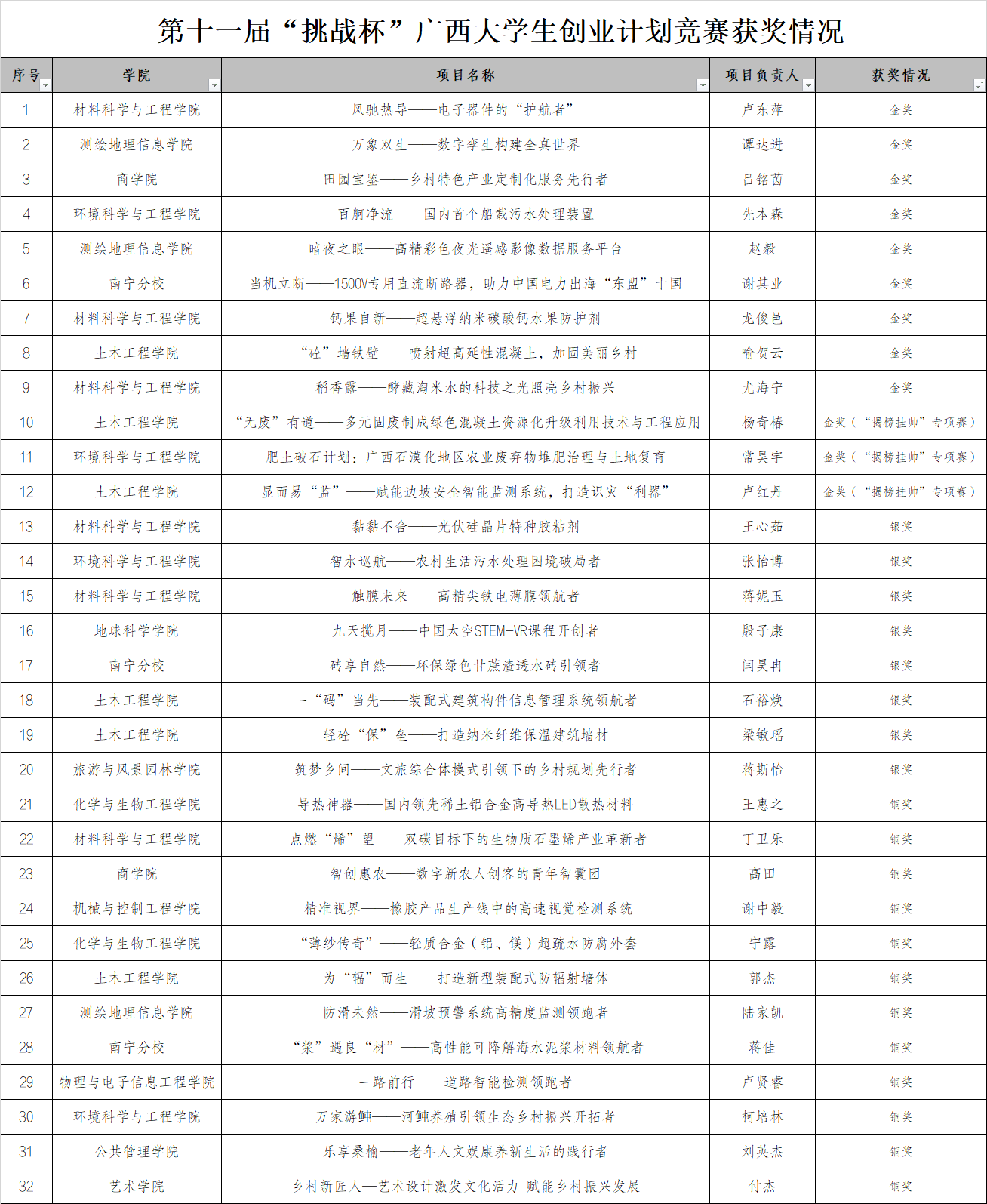 近日,由共青團(tuán)廣西區(qū)委、自治區(qū)教育廳、自治區(qū)科協(xié)、廣西學(xué)聯(lián)共同主辦的第十一屆“挑戰(zhàn)杯”廣西大學(xué)生創(chuàng)業(yè)計(jì)劃競(jìng)賽獲獎(jiǎng)名單正式公布。經(jīng)過(guò)激烈角逐,我校共有32件參賽作品脫穎而出,榮獲金獎(jiǎng)12項(xiàng)(含3項(xiàng)擂主金獎(jiǎng))、銀獎(jiǎng)8項(xiàng)、銅獎(jiǎng)12項(xiàng)。我校以金獎(jiǎng)數(shù)、總積分“雙第一”的優(yōu)異成績(jī)成功捧起該賽事最高集體榮譽(yù)“挑戰(zhàn)杯”,并榮獲優(yōu)秀組織獎(jiǎng),創(chuàng)造歷史最佳成績(jī)。