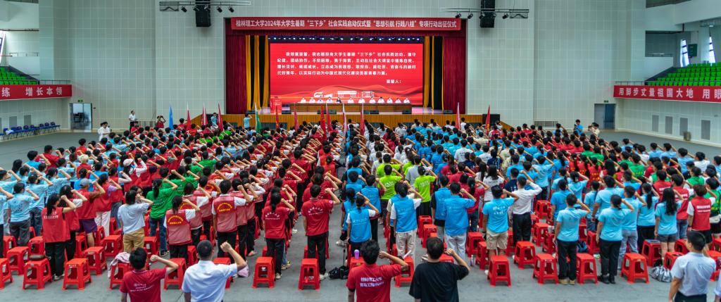 7月11日,學(xué)校在雁山校區(qū)新體育館舉行2024年暑期“三下鄉(xiāng)”社會(huì)實(shí)踐啟動(dòng)儀式暨“思想引航 行踐八桂”專(zhuān)項(xiàng)行動(dòng)出征儀式。校領(lǐng)導(dǎo)鄧軍、王敦球、吳志強(qiáng)、韋學(xué)敏、王磊、黎貞崇、曾繁榮出席活動(dòng)。學(xué)校黨委常委唐壯東、葉昊、邱杰,校長(zhǎng)助理張成龍,學(xué)生工作部、研究生工作部、校團(tuán)委、各學(xué)院等相關(guān)單位部門(mén)負(fù)責(zé)人,社會(huì)實(shí)踐團(tuán)隊(duì)指導(dǎo)老師以及學(xué)生代表400余人參加活動(dòng)。活動(dòng)由學(xué)校黨委副書(shū)記吳志強(qiáng)主持。