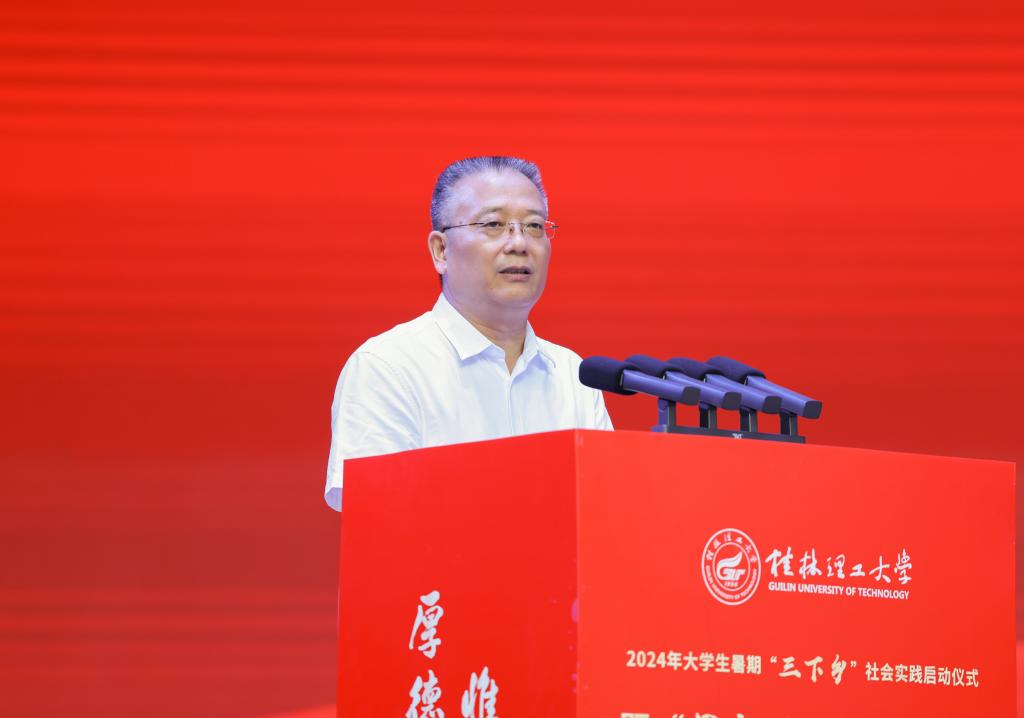 學(xué)校黨委書(shū)記鄧軍宣布2024年暑期“三下鄉(xiāng)”社會(huì)實(shí)踐暨“思想引航 行踐八桂”專(zhuān)項(xiàng)行動(dòng)正式出征。