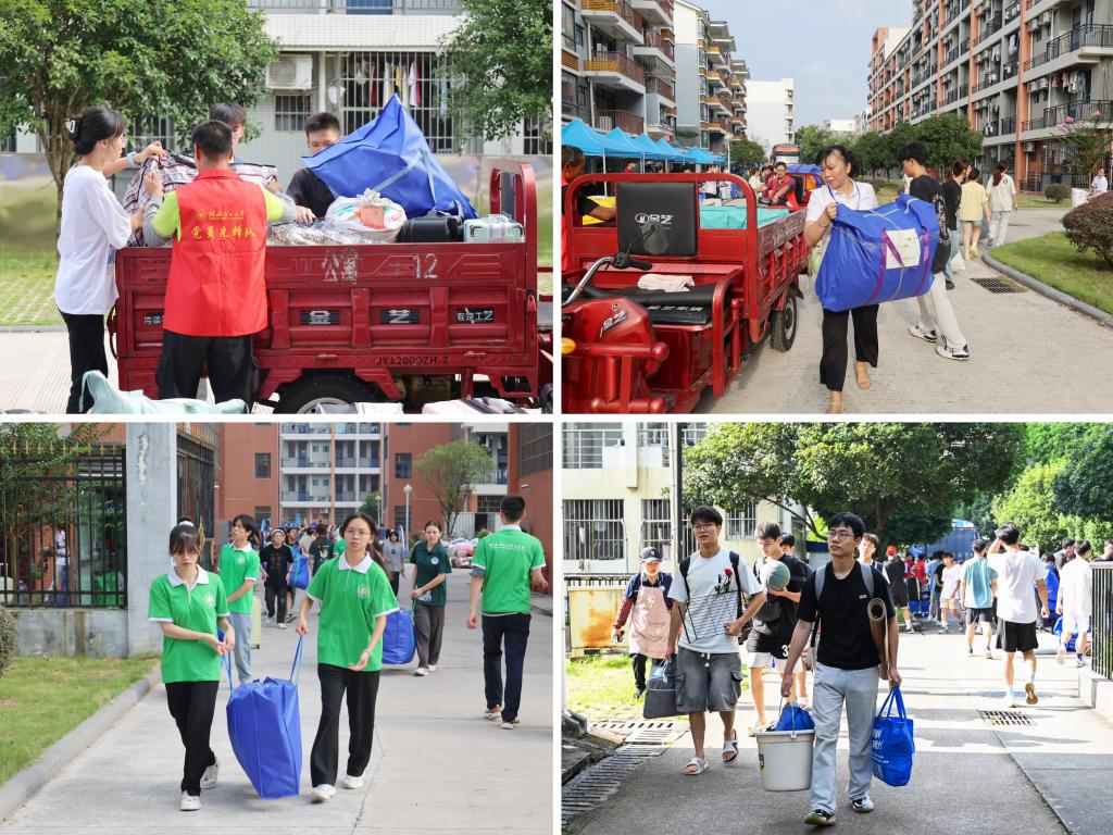 本次學(xué)生宿舍搬遷由雁山校區(qū)搬遷至屏風(fēng)校區(qū),涉及材料科學(xué)與工程學(xué)院、土木工程學(xué)院、商學(xué)院的本科學(xué)生共計1752人。在搬遷過程中,相關(guān)單位負(fù)責(zé)人、輔導(dǎo)員、班主任、醫(yī)療、保衛(wèi)、后勤人員以及學(xué)生志愿者等緊密配合、有序推進。學(xué)校根據(jù)宿舍分布情況,合理安排各學(xué)院學(xué)生分批分時段搬遷,確保各批次學(xué)生入住“無縫對接”;學(xué)校在兩校區(qū)內(nèi)搭建100余頂防雨防曬帳篷,設(shè)置了客車、貨車停靠點及行李集中存放點,并為學(xué)生提供“愛心小推車”“暖心三輪車”“免費飲用水供應(yīng)點”等系列服務(wù);食堂適當(dāng)提前和延后營業(yè)時間,滿足搬遷學(xué)生就餐需求;校醫(yī)院在兩校區(qū)設(shè)置了臨時醫(yī)療服務(wù)點,為學(xué)生安全保駕護航;相關(guān)學(xué)院充分發(fā)揮學(xué)生黨員和學(xué)生骨干先鋒模范作用,成立搬遷工作志愿服務(wù)隊,為搬遷學(xué)生提供秩序維護、入住登記、搬運行李等志愿服務(wù),有力地確保了搬遷工作圓滿完成。