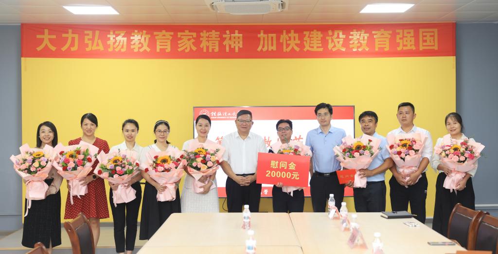 金秋九月,桃李芬芳。值第40個教師節(jié)來臨之際,為弘揚尊師重教的優(yōu)良傳統(tǒng),校領(lǐng)導(dǎo)鄧軍、王敦球、吳志強、周國清、韋學(xué)敏、王磊、黎貞崇、羅盛鋒分別率隊看望慰問一線優(yōu)秀教師和離退休教師代表,向他們致以親切問候,并向?qū)W校全體教師致以節(jié)日的祝賀,勉勵廣大教師弘揚教育家精神,爭做“大先生”,扎根三尺講壇,潛心立德樹人。