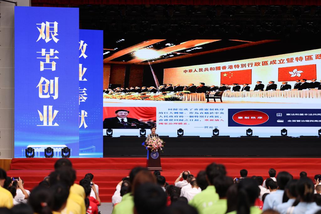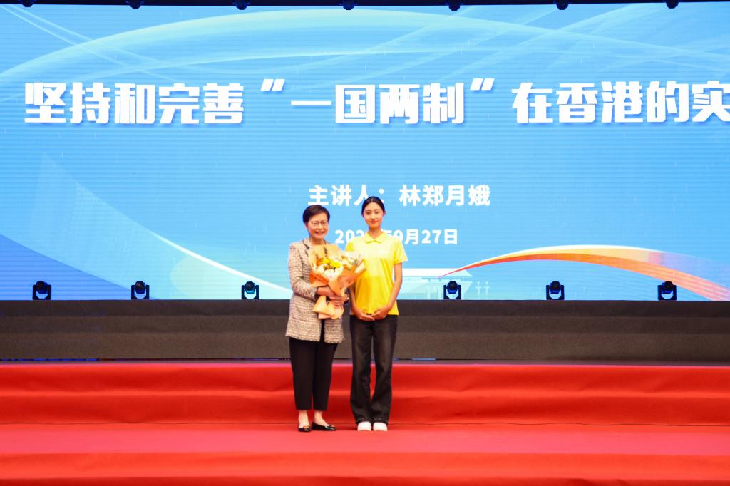 訪問期間,林鄭月娥女士以“堅持和完善‘一國兩制’在香港的實踐”為題作了精彩報告,并與現(xiàn)場師生進行互動交流。