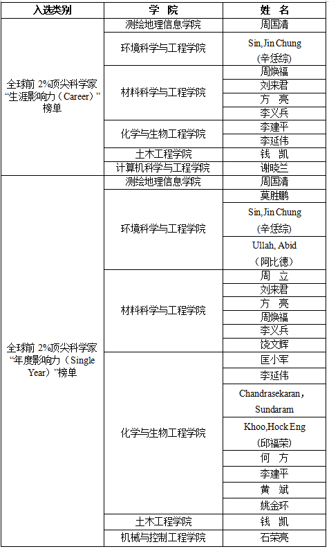 近日,美國(guó)斯坦福大學(xué)與愛(ài)思唯爾發(fā)布了2024年全球前2%頂尖科學(xué)家榜單(World's Top 2% Scientists 2024)。我校測(cè)繪地理信息學(xué)院周?chē)?guó)清等10名教師入選本期全球前2%頂尖科學(xué)家“終身科學(xué)影響力”榜單,土木工程學(xué)院錢(qián)凱等20名教師入選本期全球前2%頂尖科學(xué)家“年度科學(xué)影響力”榜單,入選人數(shù)創(chuàng)歷史新高。其中,測(cè)繪地理信息學(xué)院周?chē)?guó)清教授,環(huán)境科學(xué)與工程學(xué)院Sin,JinChung(辛恁綜)博士,材料科學(xué)與工程學(xué)院周煥福教授、劉來(lái)君教授、方亮教授、李義兵教授,化學(xué)與生物工程學(xué)院李建平教授、李延偉教授,土木工程學(xué)院錢(qián)凱教授同時(shí)入選以上兩個(gè)榜單。