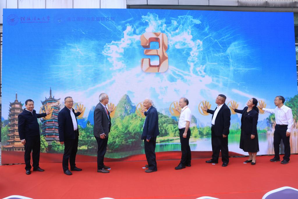 揭牌儀式上,袁道先、王雙飛、俞漢青、鄧軍、王敦球、黃少堅(jiān)、蔣春華、黎貞崇共同為漓江保護(hù)與發(fā)展研究院揭牌。