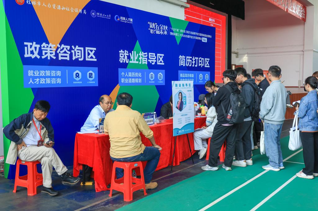 據(jù)悉,本次雙選會共有148家單位參與,提供崗位機會數(shù)4000余個,涵蓋計算機、機械、電子、新能源、地質(zhì)、建筑、教育、金融、餐飲等多個領(lǐng)域,其中陽江市人社局、佛山市人力資源公共服務(wù)中心、南昌市青云譜區(qū)人社局、桂林市人社局帶隊進校招聘,吸引2000余名學(xué)生參加。此次招聘會適逢學(xué)校建校68周年校慶日,一批校友返校參加校慶活動的同時,帶隊參加雙選會,積極選聘學(xué)校畢業(yè)生。活動現(xiàn)場氣氛十分熱烈,畢業(yè)生與用人單位從容交流,詳細(xì)了解招聘需求、福利待遇、發(fā)展空間和企業(yè)文化等信息,積極投遞簡歷,充分展現(xiàn)桂工學(xué)子勇于進取的精神面貌。