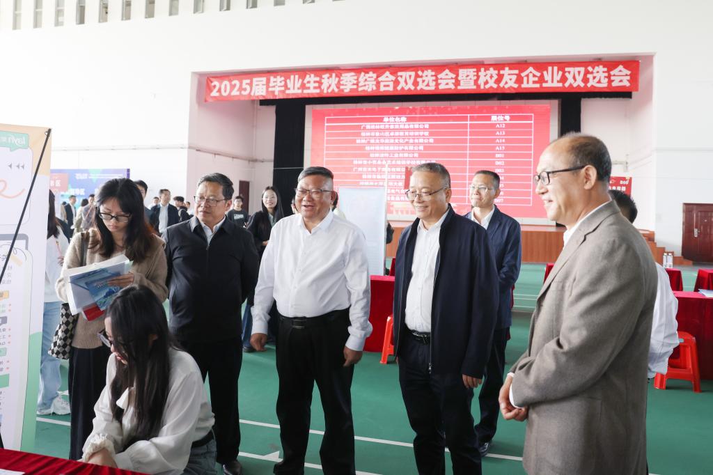 為深入貫徹落實黨中央、國務(wù)院關(guān)于高校畢業(yè)生就業(yè)工作的決策部署,加強政校企合作,搭建企業(yè)人才供需平臺,11月10日,我校在雁山校區(qū)體育訓(xùn)練館舉辦2025屆畢業(yè)生綜合雙選會暨校友企業(yè)雙選會。學(xué)校黨委書記鄧軍,黨委副書記、校長王敦球,黨委副書記吳志強到現(xiàn)場指導(dǎo),職能部門相關(guān)負(fù)責(zé)人和二級學(xué)院負(fù)責(zé)人、畢業(yè)班輔導(dǎo)員到現(xiàn)場與用人單位洽談,并悉心指導(dǎo)畢業(yè)生求職。