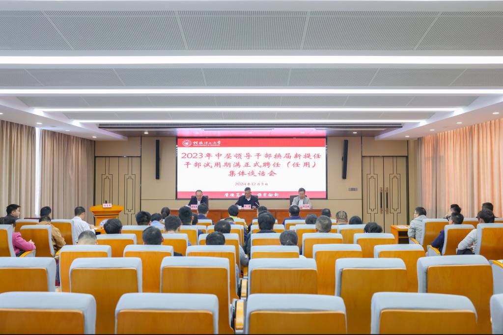 根據(jù)干部任用有關(guān)規(guī)定和組織程序,12月3日下午,學(xué)校在雁山校區(qū)行知樓報(bào)告廳召開2023年中層領(lǐng)導(dǎo)干部換屆新提任干部試用期滿正式聘任(任用)集體談話會(huì)。會(huì)議深入學(xué)習(xí)貫徹黨的二十大和二十屆二中、三中全會(huì)精神,勉勵(lì)全體試用期滿正式聘任(任用)干部踐行好新時(shí)代好干部標(biāo)準(zhǔn),進(jìn)一步統(tǒng)一思想認(rèn)識(shí),提高政治站位,牢記使命任務(wù),強(qiáng)化責(zé)任擔(dān)當(dāng),全力開創(chuàng)工作新局面。