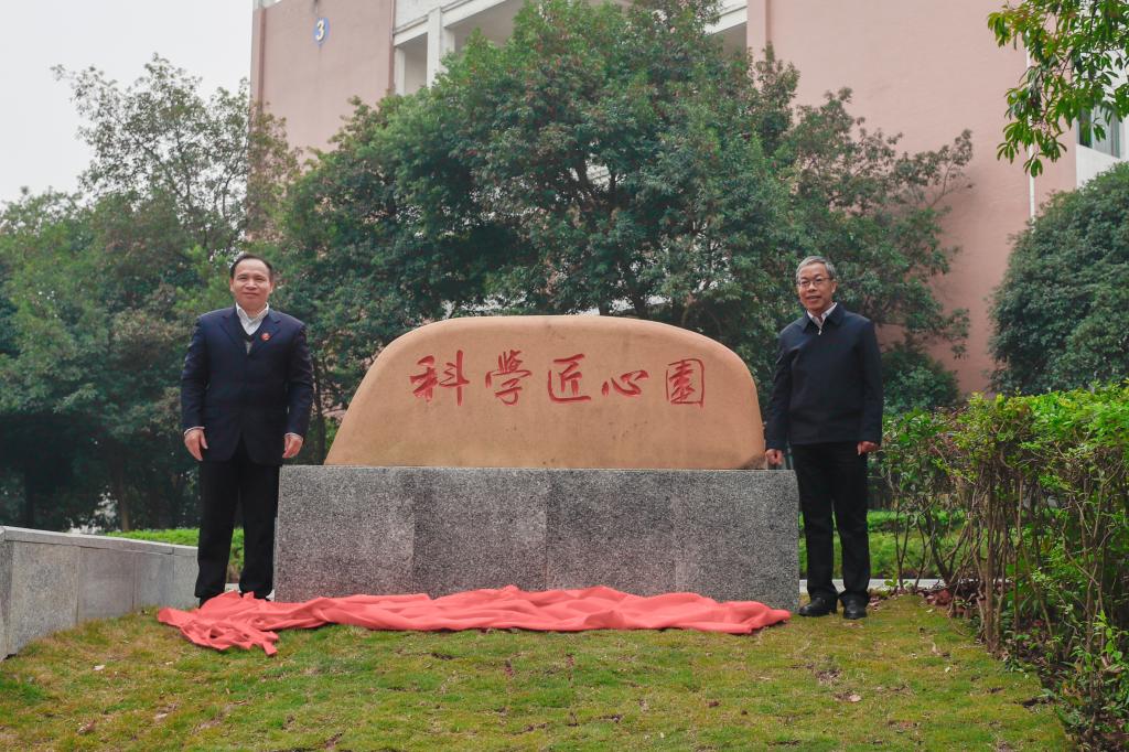 學(xué)校副校長周國清,黨委常委、副校長黎貞崇為科學(xué)匠心園揭牌