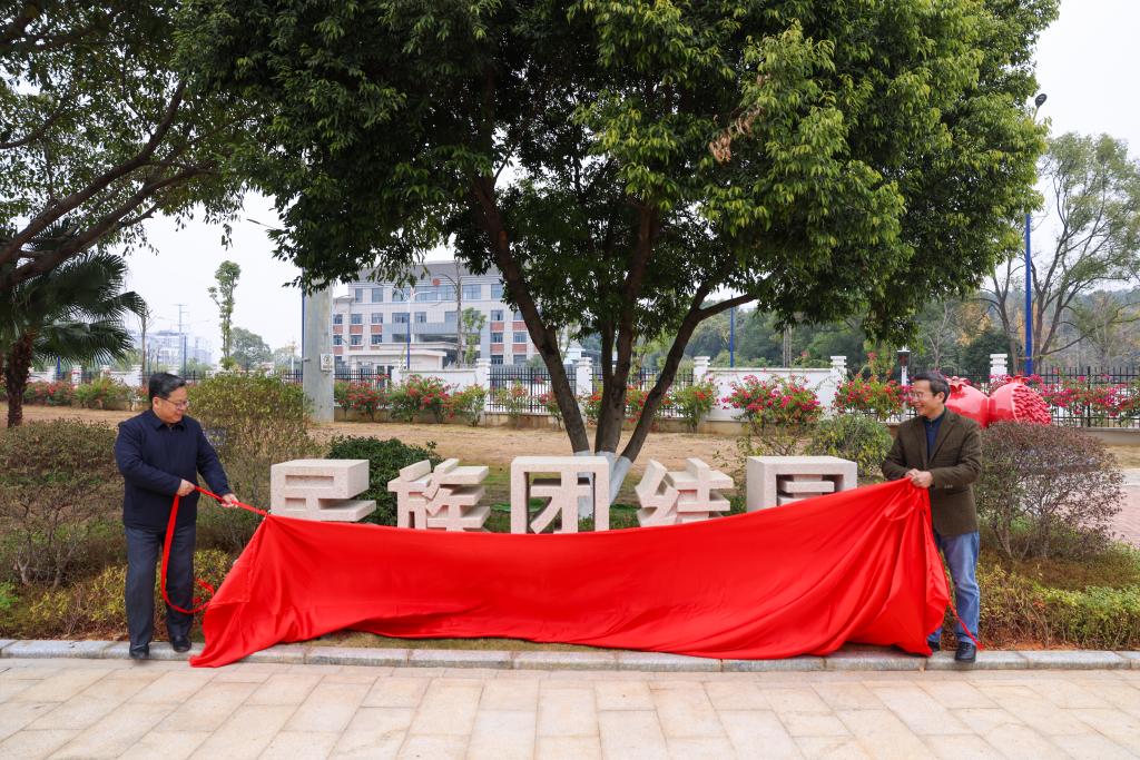 學(xué)校黨委副書記吳志強(qiáng),自治區(qū)紀(jì)委監(jiān)委駐校紀(jì)檢監(jiān)察組組長,學(xué)校黨委常委、紀(jì)委書記韋學(xué)敏為民族團(tuán)結(jié)園揭牌
