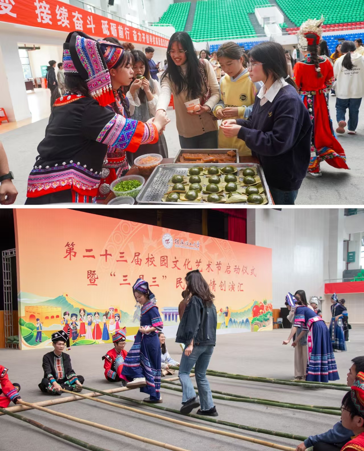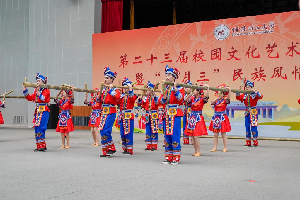 啟動儀式后,“三月三”民族風(fēng)情創(chuàng)演匯與民族風(fēng)情游園活動同步展開。街舞、服裝走秀、非遺雜技、歌伴舞等節(jié)目精彩上演,“踏歌行”“風(fēng)火輪”“背簍接福”等特色體驗(yàn)項(xiàng)目趣味橫生。整場活動以多元形式呈現(xiàn)“民族風(fēng)情”與“桂工精神”的深度融合,為校園增添了一抹亮麗的文化底色。