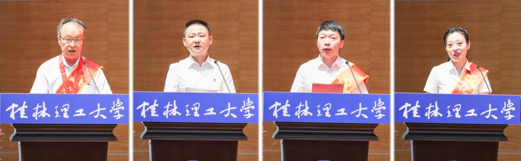 “光榮在黨50年”代表、離退休黨委牛秦洲,先進(jìn)基層黨組織代表、土木工程學(xué)院黨委書(shū)記曾榕,優(yōu)秀共產(chǎn)黨員代表、地球科學(xué)學(xué)院教師柴明春,優(yōu)秀黨務(wù)工作者代表、物理與電子信息工程學(xué)院專(zhuān)職組織員夏琳作為先進(jìn)典型代表發(fā)言,分享了在各自崗位上加強(qiáng)基層組織建設(shè)、立足崗位作奉獻(xiàn)、奮發(fā)有為當(dāng)先鋒的經(jīng)驗(yàn)體會(huì)。