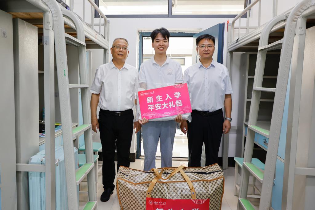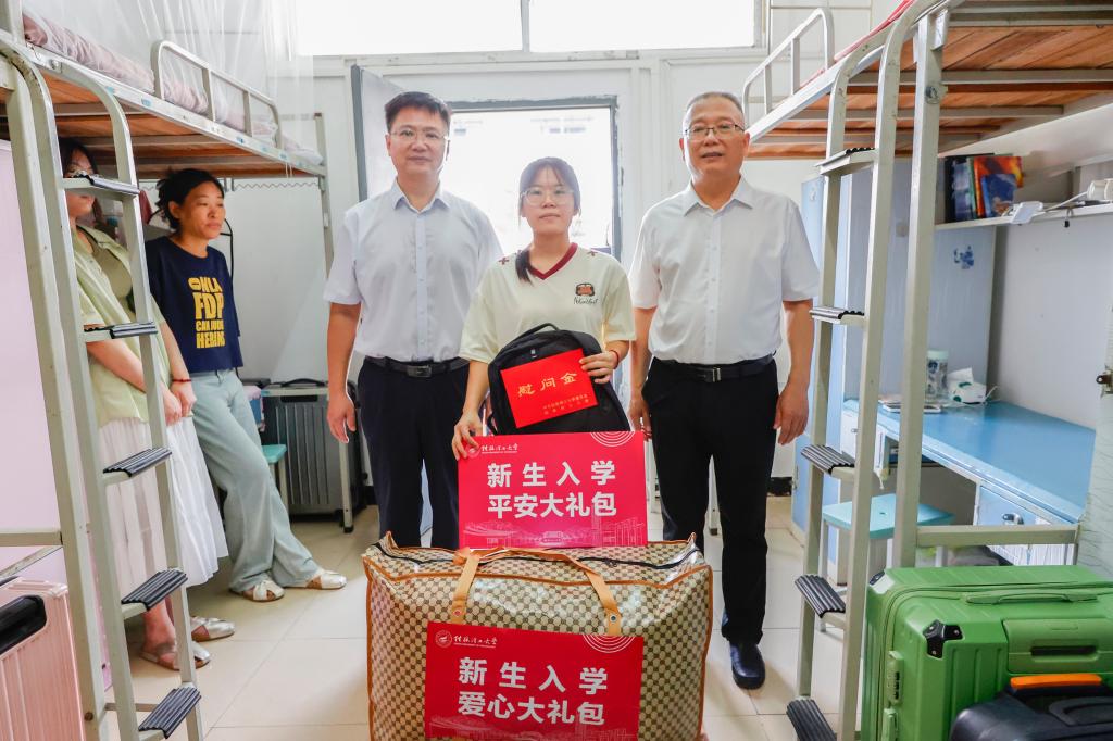 在學生宿舍,校領導與新生親切交流,關(guān)心大家入學后的適應情況與生活需求,并贈送了平安大禮包、愛心大禮包和學習用品,鼓勵同學們盡快融入新環(huán)境、合理規(guī)劃大學生活、保持積極心態(tài)、勇于探索創(chuàng)新,在桂工度過充實而美好的求學時光。