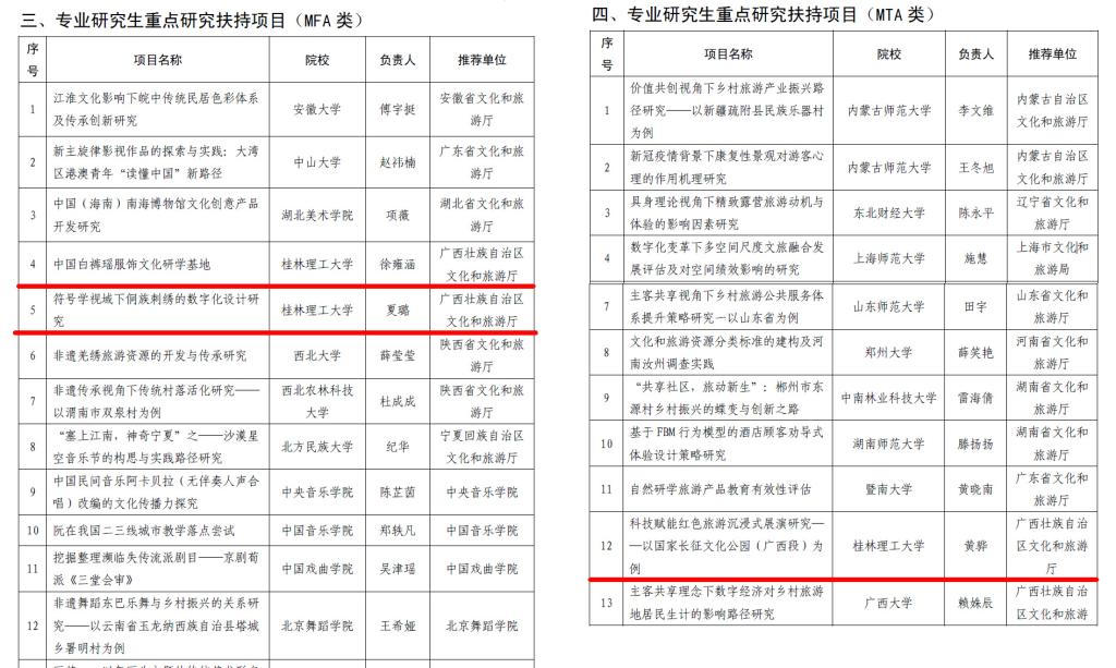 近日,文化和旅游部辦公廳發(fā)布了《關(guān)于公布2022年度文化藝術(shù)職業(yè)教育和旅游職業(yè)教育提質(zhì)培優(yōu)行動(dòng)計(jì)劃入選項(xiàng)目名單的通知》(辦科教發(fā)〔2022〕140號), 我校共有3名碩士研究生申報(bào)的項(xiàng)目入選該行動(dòng)計(jì)劃項(xiàng)目立項(xiàng)。其中藝術(shù)學(xué)院2021級藝術(shù)專業(yè)徐雍涵申報(bào)的《中國白褲瑤服飾文化研學(xué)基地》和2020級藝術(shù)專業(yè)研究生夏璐申報(bào)的《符號學(xué)視域下侗族刺繡的數(shù)字化設(shè)計(jì)研究》入選專業(yè)研究生重點(diǎn)研究扶持項(xiàng)目MFA類立項(xiàng)(全國共14項(xiàng),全區(qū)僅2項(xiàng)),旅游與風(fēng)景園林學(xué)院2021級MTA學(xué)生黃驊申報(bào)的《科技賦能紅色旅游沉浸式展演研究——以國家長征文化公園(廣西段)為例》入選專業(yè)研究生重點(diǎn)研究扶持項(xiàng)目MTA類立項(xiàng)(全國共20項(xiàng),全區(qū)僅2項(xiàng))。