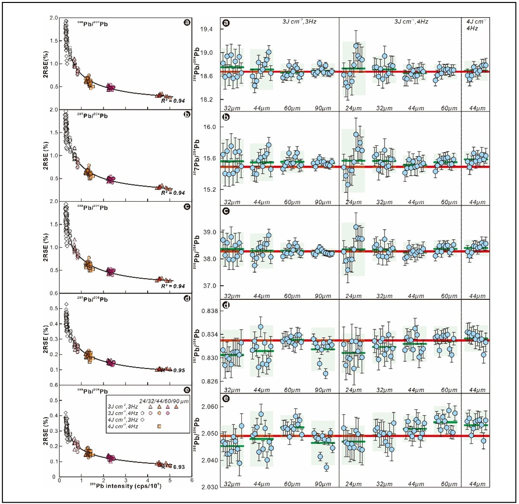 不同激光剝蝕條件下國際標(biāo)樣BHVO-2G的Pb同位素2RSE(%)及組成