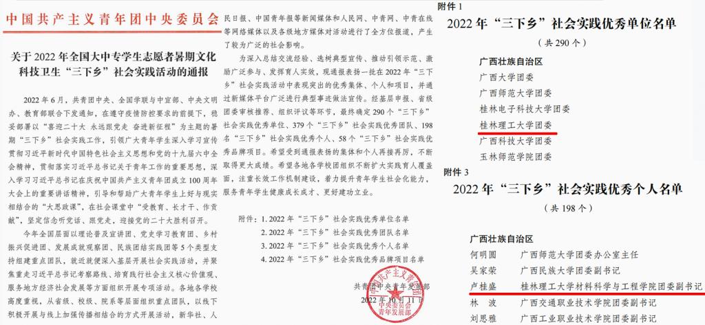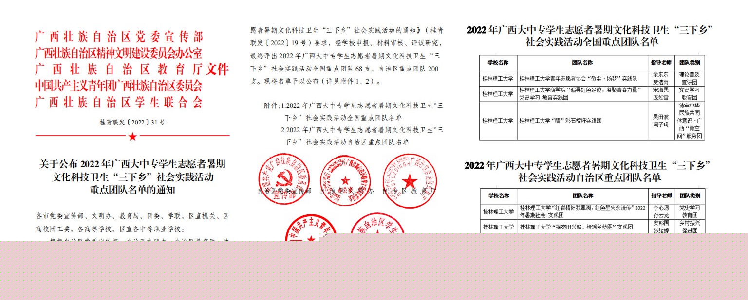 近日,共青團中央青年發(fā)展部對在2022年全國大中專學(xué)生志愿者暑期“三下鄉(xiāng)”社會實踐活動中表現(xiàn)突出的集體、團隊和個人進行通報表揚,我校團委榮獲2022年全國大中專學(xué)生志愿者暑期文化科技衛(wèi)生“三下鄉(xiāng)”社會實踐活動優(yōu)秀單位稱號,材料科學(xué)與工程學(xué)院盧桂盛老師獲評社會實踐優(yōu)秀個人。在2022年廣西大中專學(xué)生志愿者暑期“三下鄉(xiāng)”社會實踐活動通報中,商學(xué)院“追尋紅色足跡,凝聚青春力量”黨史學(xué)習(xí)教育實踐團獲評優(yōu)秀團隊,地球科學(xué)學(xué)院“六年傳承,四大計劃,致力服務(wù)少兒地學(xué)科普啟蒙教育”項目獲評優(yōu)秀品牌項目。