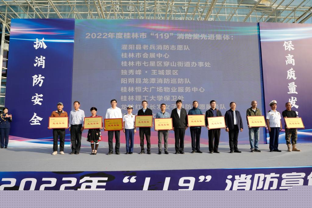 11月8日上午,桂林市2022年“119”消防宣傳月啟動(dòng)儀式暨消防科普嘉年華活動(dòng)在七星區(qū)會(huì)展中心舉行。啟動(dòng)儀式為榮獲“桂林市119消防獎(jiǎng)先進(jìn)集體”和“桂林市119消防獎(jiǎng)先進(jìn)個(gè)人”頒獎(jiǎng),我校保衛(wèi)處榮獲“桂林市119消防獎(jiǎng)先進(jìn)集體”榮譽(yù)稱號、王治國獲“桂林市119消防獎(jiǎng)先進(jìn)個(gè)人”榮譽(yù)稱號。