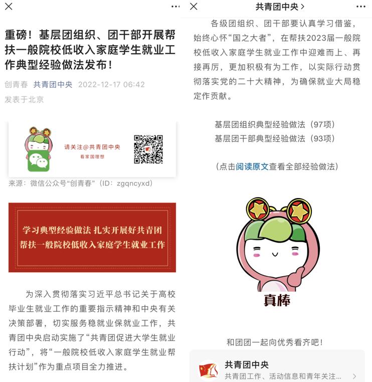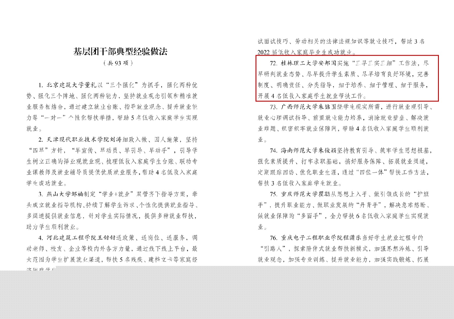 為深入貫徹落實習近平總書記關于高校畢業(yè)生就業(yè)工作的重要指示精神和中央有關決策部署,切實服務穩(wěn)就業(yè)保就業(yè)工作,共青團中央啟動實施了“共青團促進大學生就業(yè)行動”,將“一般院校低收入家庭學生就業(yè)幫扶計劃”作為重點項目全力推進。近日,共青團中央發(fā)布《基層團干部典型經(jīng)驗做法(93項)》,選取93項團干部在具體工作中總結提煉的好經(jīng)驗好做法進行發(fā)表,我校共青團干部安邦國老師的典型經(jīng)驗做法被收錄發(fā)表。
