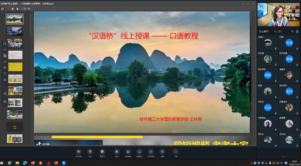 “文旅桂林”線上團(tuán)組交流項(xiàng)目是我校承辦的第一個“漢語橋”項(xiàng)目,實(shí)現(xiàn)了“零”的突破。此次項(xiàng)目的成功申報(bào)與舉辦,是學(xué)校堅(jiān)持走國際化、開放式辦學(xué)道路的一項(xiàng)重要舉措。國際教育學(xué)院將以此為契機(jī),繼續(xù)拓展對外交流合作渠道,搭建新的中外人文交流平臺,提高國際教育辦學(xué)水平,為“講好中國故事、傳播好中國聲音,展現(xiàn)可信、可愛、可敬的中國形象”貢獻(xiàn)桂工力量。