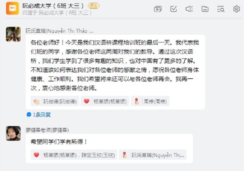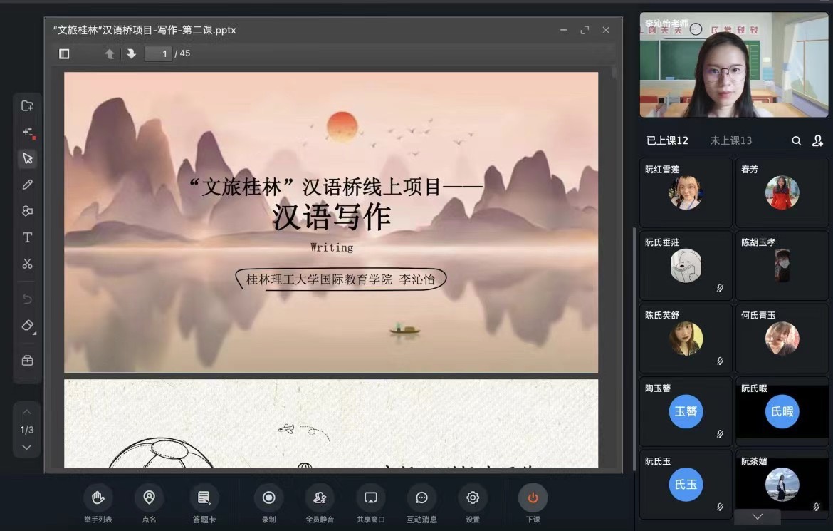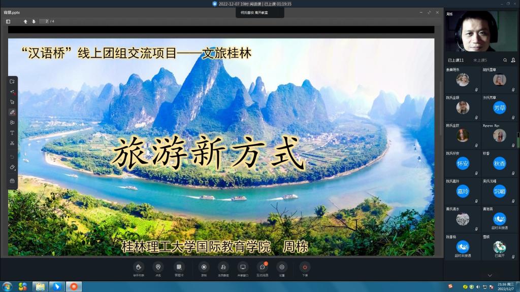 近日,由教育部中外語言交流合作中心主辦、我校承辦的2022年“漢語橋”之“文旅桂林”線上團(tuán)組交流項(xiàng)目順利完成。來自越南的180余名青年學(xué)子與我校國際教育學(xué)院的教師們一起“邂逅云端”,暢游“文旅桂林”,圓滿完成了為期四周共計(jì)112個學(xué)時的線上漢語學(xué)習(xí)和文化體驗(yàn)課程。