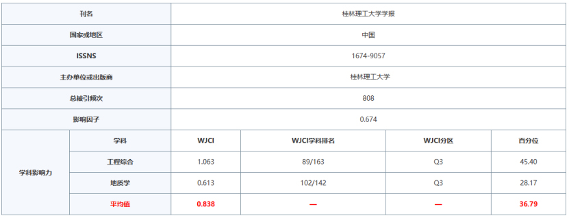 日前,《科技期刊世界影響力指數(shù)(WJCI)報(bào)告》(2022版)正式發(fā)布,《桂林理工大學(xué)學(xué)報(bào)》再次入選,在工程綜合及地質(zhì)學(xué)學(xué)科中WJCI 指數(shù)分別為1.063和0.613,均分布于Q3區(qū)。