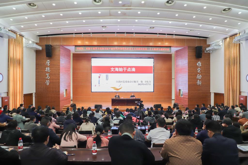 為深入學(xué)習(xí)貫徹落實(shí)黨的二十大精神,進(jìn)一步加強(qiáng)干部隊(duì)伍能力建設(shè),打造一支“提筆能寫、開口能說、問策能對(duì)”的高素質(zhì)干部隊(duì)伍,學(xué)校在處科級(jí)干部學(xué)習(xí)貫徹習(xí)近平新時(shí)代中國特色社會(huì)主義思想和黨的二十大精神專題研討班專門設(shè)置公文寫作培訓(xùn)環(huán)節(jié)。4月7日下午,自治區(qū)黨委辦公廳秘書一處副處長衛(wèi)東方應(yīng)邀到我校作題為《文海始于點(diǎn)滴》的公文寫作專題輔導(dǎo)報(bào)告。報(bào)告會(huì)由學(xué)校黨委常委、紀(jì)委書記韋學(xué)敏主持。