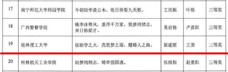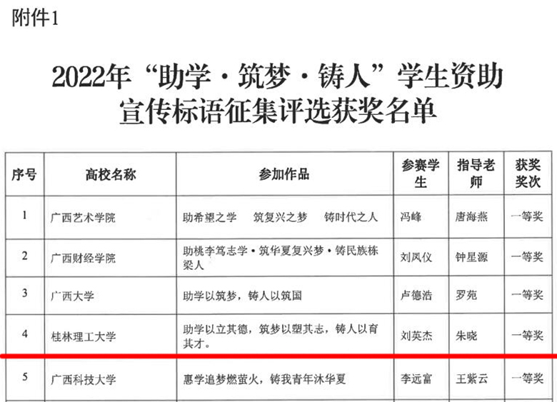 學(xué)校學(xué)生資助管理中心高度重視此次宣傳標(biāo)語征集評選活動,動員廣大學(xué)生積極參與,經(jīng)學(xué)院推薦、校內(nèi)專家評審,擇優(yōu)報(bào)送作品到自治區(qū)教育廳參評。下一步,學(xué)校將不斷加強(qiáng)學(xué)生資助政策和成效宣傳,努力講好學(xué)生資助故事,凝聚資助育人正能量,營造濃厚的資助育人文化氛圍,激勵(lì)廣大桂工學(xué)子奮發(fā)自強(qiáng)、立志成才、誠實(shí)守信、感恩奉獻(xiàn)。