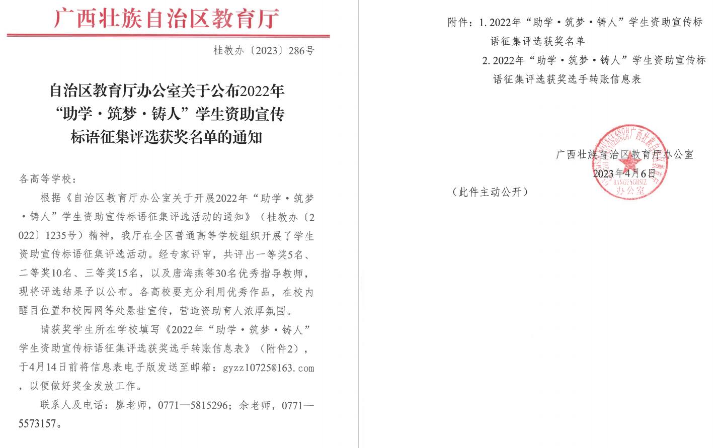近日,2022年全區(qū)“助學(xué)·筑夢·鑄人”學(xué)生資助宣傳標(biāo)語征集評選活動獲獎(jiǎng)名單公布,我校公共管理與傳媒學(xué)院劉英杰同學(xué)的作品《助學(xué)以立其德,筑夢以塑其志,鑄人以育其才》、商學(xué)院梁建麗同學(xué)的作品《續(xù)助學(xué)之火,亮筑夢之塔,耀鑄人之路》分別榮獲一等獎(jiǎng)、三等獎(jiǎng),朱曉、王賢兩位老師榮獲優(yōu)秀指導(dǎo)老師。