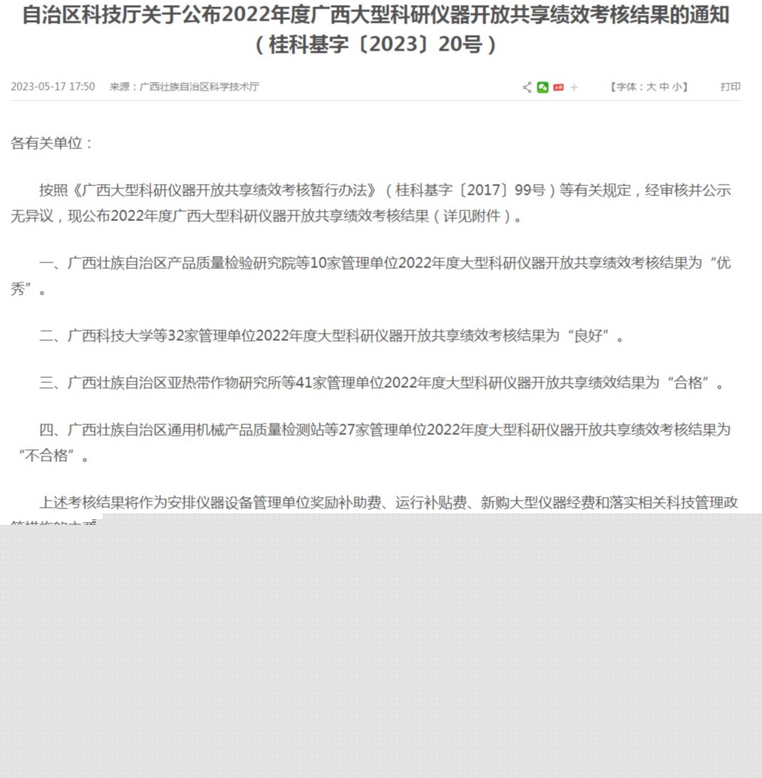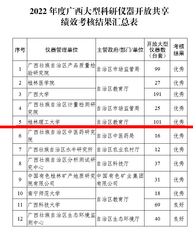 近日,根據(jù)自治區(qū)科技廳發(fā)布《2022年度廣西大型科研儀器開(kāi)放共享績(jī)效考核結(jié)果的通知》,我校在2022年廣西區(qū)大型科研儀器設(shè)備共享績(jī)效考核中獲得優(yōu)秀,這也是我校自2020年以來(lái),連續(xù)三年獲此榮譽(yù)。