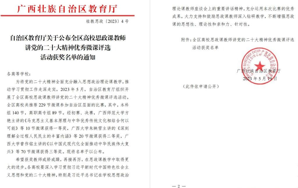 近日,自治區(qū)教育廳公布了全區(qū)高校思政課教師講黨的二十大精神優(yōu)秀微課評選活動獲獎名單,我校商學(xué)院教師梁譯勻講授的微課《深刻領(lǐng)會習(xí)近平生態(tài)文明思想 爭做守護(hù)漓江生態(tài)的“二郎神”》、南寧分校教師張凱講授的微課《牢記“三個務(wù)必” 奏響青春奮進(jìn)三部曲》榮獲全區(qū)三等獎。