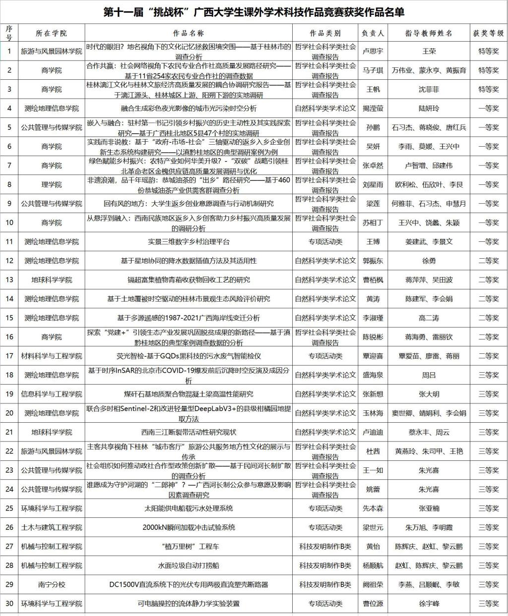 近日,由共青團(tuán)廣西區(qū)委、自治區(qū)教育廳、自治區(qū)科協(xié)、廣西學(xué)聯(lián)主辦的第十一屆“挑戰(zhàn)杯”廣西大學(xué)生課外學(xué)術(shù)科技作品競(jìng)賽結(jié)果正式公布。經(jīng)過(guò)激烈角逐,學(xué)校參賽作品獲特等獎(jiǎng)3項(xiàng)、一等獎(jiǎng)8項(xiàng)、二等獎(jiǎng)6項(xiàng)、三等獎(jiǎng)13項(xiàng),學(xué)校獲“優(yōu)勝杯”和“優(yōu)秀組織獎(jiǎng)”。