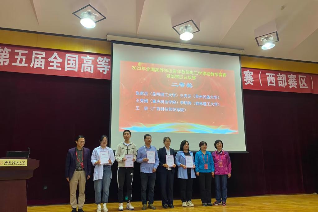 6月2日至6月4日,2023年全國高等學(xué)校青年教師電工學(xué)課程教學(xué)競賽西部賽區(qū)選拔賽在西安理工大學(xué)舉辦,我校機(jī)械與控制工程學(xué)院職燕老師榮獲大賽特等獎并代表廣西賽區(qū)參加全國決賽,吳東老師和石榮亮老師榮獲大賽一等獎,李明濤老師榮獲大賽二等獎。
