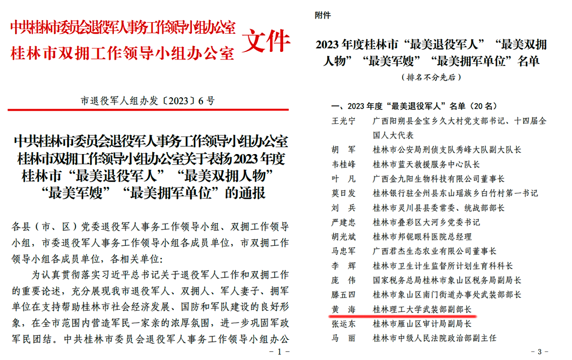 近日,中共桂林市委員會退役軍人事務(wù)工作領(lǐng)導(dǎo)小組辦公室、桂林市雙擁工作領(lǐng)導(dǎo)小組辦公室聯(lián)合桂林市退役軍人事務(wù)局、桂林警備區(qū)政治工作處開展2023年桂林市“最美退役軍人”“最美雙擁人物”“最美軍嫂”“最美擁軍單位”評選活動,我校黨委武裝部黃海同志作為桂林市高校唯一入選代表榮獲桂林市“最美退役軍人”稱號。