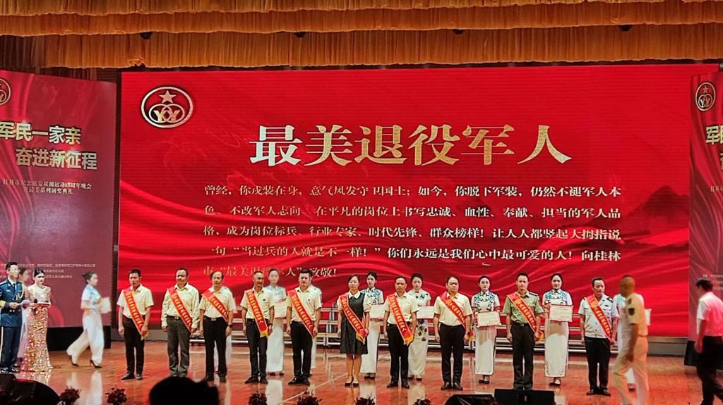 7月8日晚,“軍民一家親 奮進(jìn)新征程”桂林市紀(jì)念延安雙擁運(yùn)動80周年晚會暨“最美”系列頒獎典禮在桂林市委黨校隆重舉行。黃海同志與其他19位“最美退役軍人”代表一同上臺領(lǐng)獎。