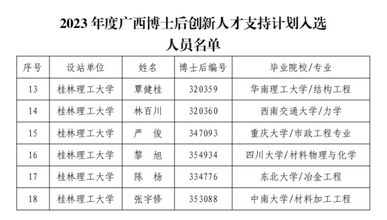 日前,自治區(qū)人力資源社會保障廳公布了2023年度廣西博士后創(chuàng)新人才支持計劃入選結(jié)果,我校地質(zhì)資源與地質(zhì)工程博士后流動站的覃健桂、林百川(合作導師:錢凱教授)、環(huán)境科學與工程博士后流動站的嚴?。ê献鲗煟簭垖W洪教授)、材料科學與工程博士后流動站的黎旭(合作導師:周煥福教授)、陳楊、張宇修(合作導師:龍飛教授)等6名博士后位列其中,入選人數(shù)為全區(qū)高校第一。