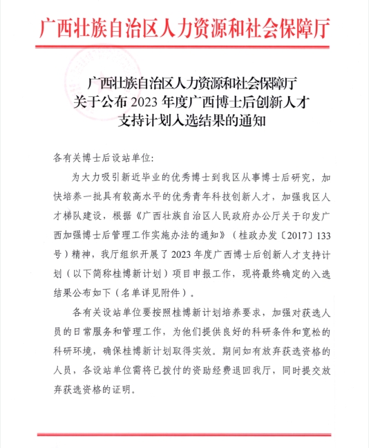 據(jù)悉,廣西博士后創(chuàng)新人才支持計劃旨在大力吸引優(yōu)秀博士畢業(yè)生到我區(qū)從事博士后研究,聚焦重大戰(zhàn)略、重大產(chǎn)業(yè)、戰(zhàn)略性新興產(chǎn)業(yè)及高校“雙一流”建設(shè),培育一批具有較高水平的青年科技人才。2023年度全區(qū)共有22名博士后入選該計劃。近年來,學校不斷加強博士后隊伍建設(shè),博士后管理工作規(guī)范化、制度化水平不斷提升。下一步,學校將大力實施“人才強?!睉?zhàn)略,創(chuàng)新博士后管理工作思路,深化體制機制改革,不斷加大優(yōu)秀應(yīng)屆博士進站力度,為進一步推動學校學科建設(shè)和“雙一流”建設(shè)提供青年人才儲備。