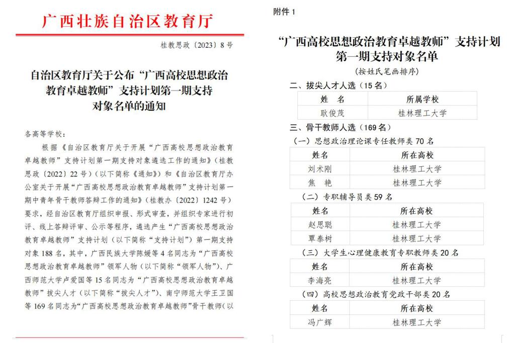 近日,自治區(qū)黨委教育工委、自治區(qū)教育廳公布“廣西高校思想政治教育卓越教師”支持計(jì)劃第一期支持對(duì)象名單,我校馬克思主義學(xué)院黨委書記耿俊茂入選“廣西高校思想政治教育卓越教師”拔尖人才人選,馬克思主義學(xué)院教師焦艷、劉術(shù)剛?cè)脒x“廣西高校思想政治教育卓越教師”骨干教師人選(專任教師),材料科學(xué)與工程學(xué)院團(tuán)委書記趙思聰、商學(xué)院團(tuán)委副書記覃泰樹入選“廣西高校思想政治教育卓越教師”骨干教師人選(專職輔導(dǎo)員),學(xué)生工作部(處)部(處)長(zhǎng)馮廣輝入選“廣西高校思想政治教育卓越教師”骨干教師人選(黨政干部),學(xué)生工作部(處)部(處)心理健康教育與咨詢中心主任李海亮入選“廣西高校思想政治教育卓越教師”骨干教師人選(大學(xué)生心理健康教育專職教師)。