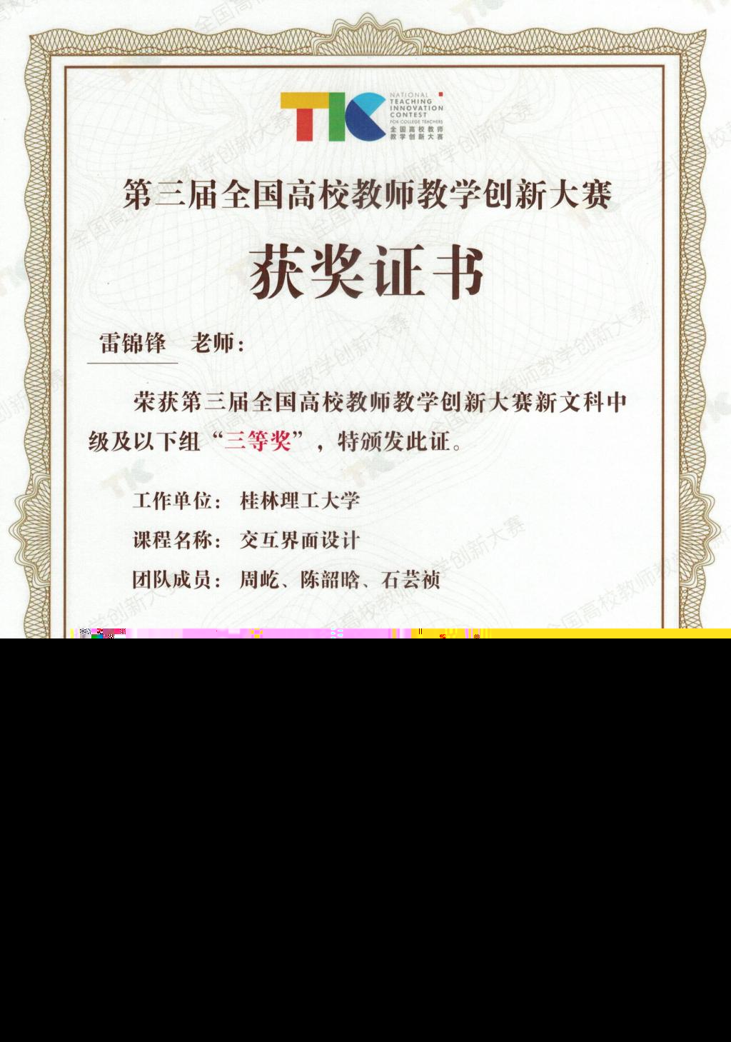 近日,第三屆全國高校教師教學(xué)創(chuàng)新大賽在浙江大學(xué)落下帷幕。我校藝術(shù)學(xué)院產(chǎn)品設(shè)計專業(yè)教師雷錦鋒主講課程“交互界面設(shè)計”榮獲新文科中級及以下組三等獎,取得學(xué)校在此項賽事中的最好成績。