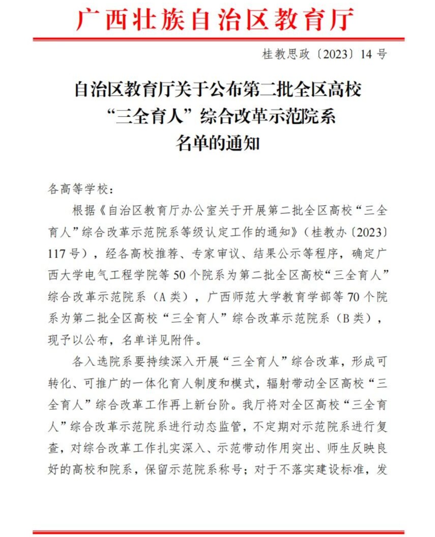 截止目前,加上已經(jīng)入選第一批全區(qū)高?!叭恕本C合改革示范院系的材料科學(xué)與工程學(xué)院、化學(xué)與生物工程學(xué)院、測繪地理信息學(xué)院,我校已有7個學(xué)院成功入選全區(qū)高校“三全育人”綜合改革示范院系,入選數(shù)量名列全區(qū)前茅。