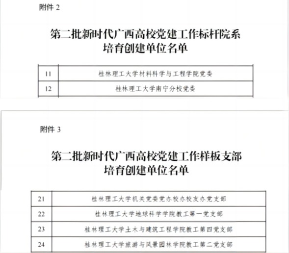 近日,自治區(qū)黨委教育工委關(guān)于公布第二批新時代廣西高校黨建示范創(chuàng)建和質(zhì)量創(chuàng)優(yōu)工作培育創(chuàng)建單位名單,我校材料科學(xué)與工程學(xué)院黨委、南寧分校黨委等2個學(xué)院黨委入選第二批新時代廣西高校黨建工作標(biāo)桿院系培育創(chuàng)建單位,機關(guān)黨委黨辦校辦校友辦黨支部、地球科學(xué)學(xué)院教工第一黨支部、土木與建筑工程學(xué)院教工第四黨支部、旅游與風(fēng)景園林學(xué)院教工第二黨支部等4個黨支部入選第二批新時代廣西高校黨建工作樣板支部培育創(chuàng)建單位,入選數(shù)量位居全區(qū)高校前茅。