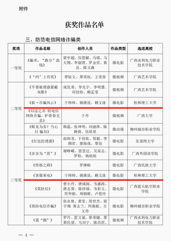 近日,廣西壯族自治區(qū)教育廳公布了2023年全區(qū)高校安全教育微電影微視頻微動(dòng)漫征集評選活動(dòng)獲獎(jiǎng)名單,我校報(bào)送的作品《新?詐騙風(fēng)云》《客服來電》分別榮獲防范電信網(wǎng)絡(luò)詐騙類二等獎(jiǎng)、三等獎(jiǎng)。