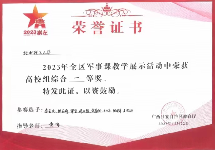 12月18日至22日,2023年全區(qū)軍事課教學(xué)展示活動在我校南寧分校空港校區(qū)舉行。經(jīng)過激烈角逐,我校代表隊(duì)在眾多參賽隊(duì)伍中脫穎而出,以綜合總分第一名榮獲一等獎。