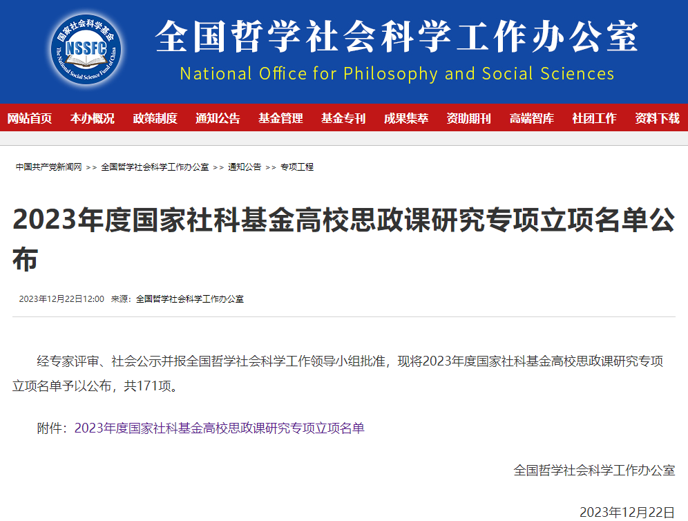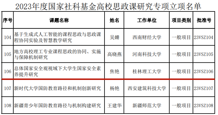 近日,全國哲學(xué)社會科學(xué)工作辦公室公布了2023年度國家社科基金高校思政課研究專項立項名單,我校馬克思主義學(xué)院副教授焦艷申報的《總體國家安全觀視域下大學(xué)生國家安全素養(yǎng)提升研究》獲批立項,實現(xiàn)了我校在國家社科基金高校思政課研究專項“零”的突破。
