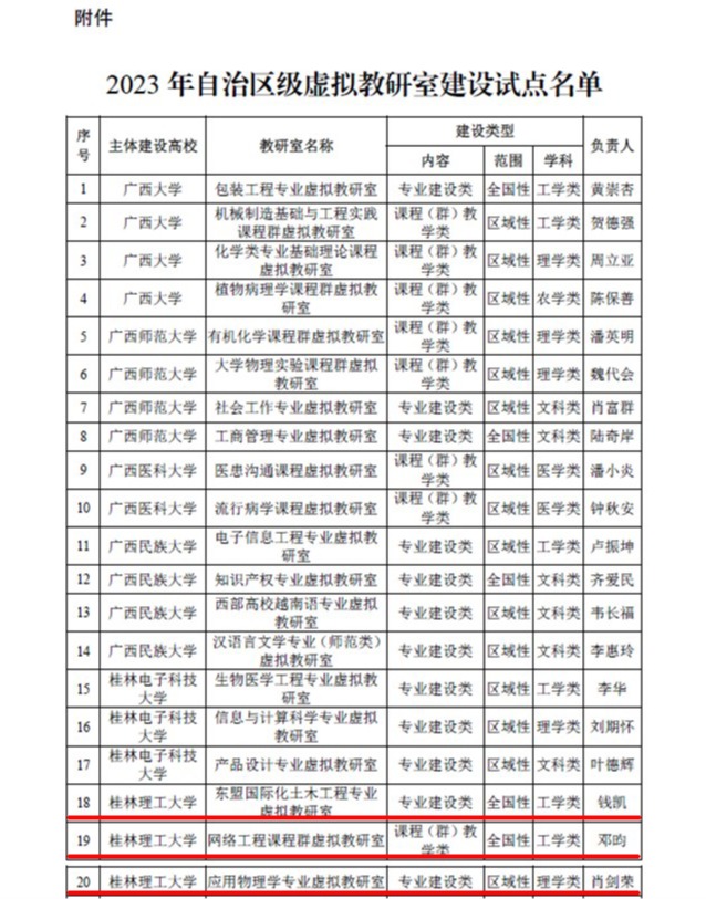 12月25日,自治區(qū)教育廳公布了 2023 年自治區(qū)級虛擬教研室建設(shè)試點(diǎn)名單,我校東盟國際化土木工程專業(yè)虛擬教研室、網(wǎng)絡(luò)工程課程群虛擬教研室、應(yīng)用物理學(xué)專業(yè)虛擬教研室等3個虛擬教研室成功入選名單。截至目前,我校共獲批8個自治區(qū)級虛擬教研室建設(shè)試點(diǎn)。