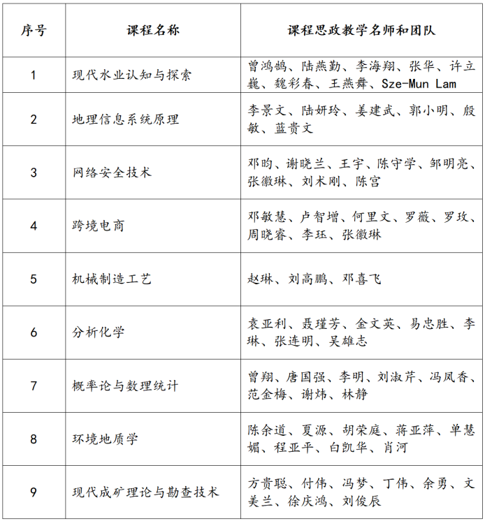近日,自治區(qū)教育廳下發(fā)了《關(guān)于公布2023年全區(qū)高校課程思政示范課程和課程思政示范基層教學(xué)組織名單的通知》(桂高教〔2024〕3號),我校推送的“現(xiàn)代水業(yè)認(rèn)知與探索”等8門本科課程、“現(xiàn)代成礦理論與勘查技術(shù)”研究生課程被認(rèn)定為自治區(qū)級課程思政示范課程,課程負(fù)責(zé)人及團(tuán)隊(duì)被認(rèn)定為自治區(qū)級課程思政教學(xué)名師和團(tuán)隊(duì);資源勘查工程教研室等3個教研室和公共管理研究教學(xué)團(tuán)隊(duì)被認(rèn)定為自治區(qū)級課程思政示范基層教學(xué)組織。
